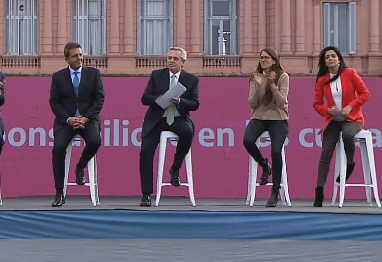 Del acto participó el Gabinete a pleno, con rol destacado para el ministro de Trabajo, Claudio Moroni, y la de las Mujeres y Género, Elizabeth Gómez Alcorta. También estuvieron la titular de la ANSES, Fernanda Raverta; del PAMI, Luana Volnovich; el líder de la UIA, Daniel Funes de Rioja y representantes de colectivos feministas y organizaciones sociales.