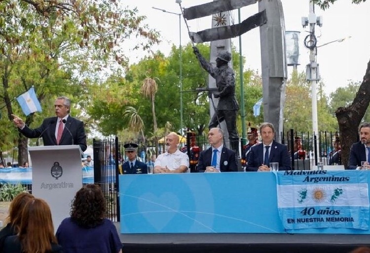 Acompañado por funcionarios, autoridades locales y veteranos, el jefe de Estado resaltó que su gestión “poco a poco fue desarmando” el acuerdo Foradori-Duncan, firmado con Gran Bretaña en 2016 durante la administración de Cambiemos.