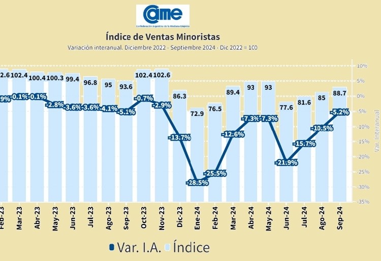 Así surge del Índice de Ventas Minoristas Pymes de la Confederación Argentina de la en Mediana Empresa (CAME), elaborado en base a un relevamiento mensual entre 1.300 comercios minoristas del país, realizado del 1 y 4 de octubre.