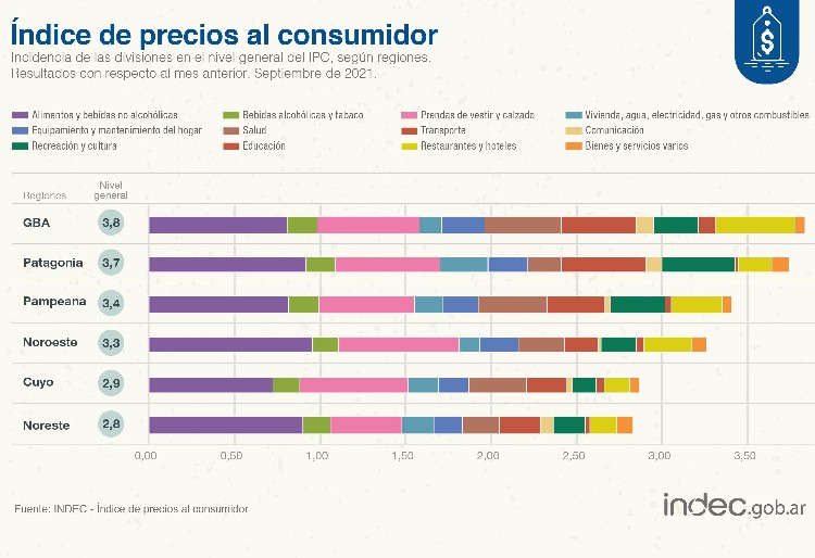 En Salud (4,3%), el alza fue impulsada en gran medida por el alza de gastos de prepagas y fue la tercera división de mayor ascenso del mes. En tanto, la suba en la división Alimentos y bebidas no alcohólicas (2,9%) fue la de mayor incidencia en todas las regiones.
