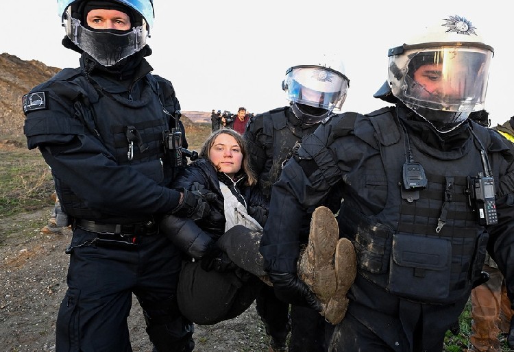 Thunberg fue llevada por tres policías y sostenida por un brazo en un lugar más alejado del borde de la mina donde anteriormente estaba sentada con el grupo. Luego fue escoltada de regreso a las camionetas de la policía y se la vio sentada sola en un gran autobús.