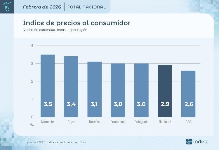 El 2,6% de febrero de este año es mayor al 2,1% de igual mes de 2025.