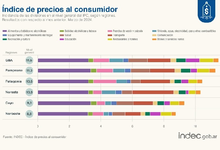 Al comparar la evolución del indice de precios por regiones, los mayores aumentos se dieron en el Gran Buenos Aires con el 11,5%. Muy cerca, la región pampeana marcó el 11,3%. La Patagonia quedó con el 10,5% de aumento en marzo, el Noreste con el 10,3%, detrás Cuyo con el 9,3% y en el último lugar el Noroeste, donde la inflación promedio de marzo quedó en 8,8%.