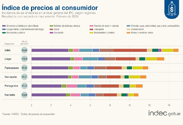 La inflación de febrero fue de 13,2%, según el Índice de Precios al Consumidor (IPC) informado este martes por el Instituto Nacional de Estadística y Censos (INDEC). El aumento interanual llegó al 276,2%.
