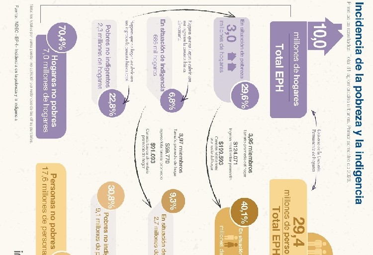 El dato del Indec corresponde al relevamiento de 31 aglomerados urbanos, que en total suman 29 millones de personas, de los cuales 11,8 millones están por debajo de la línea de pobreza. Si los porcentajes se extienden a toda la población (un poco más de 46 millones), incluyendo la rural, equivale a cerca de 18,5 millones de pobres, de los cuales 4,3 millones son indigentes.