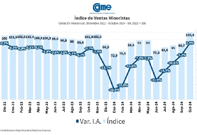 Así surge del Índice de Ventas Minoristas Pymes de la Confederación Argentina de la Mediana Empresa (CAME), elaborado en base a un relevamiento mensual entre 1.300 comercios minoristas del país, realizado del 1 y 2 de noviembre.