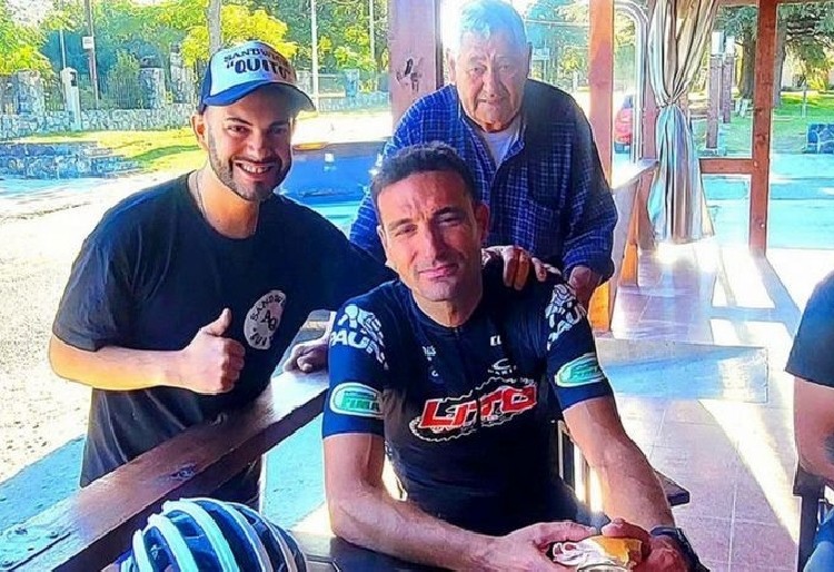 Escena 2. Lleva calzado para ajustarse a los pedales, medias altas hasta la mitad de la pantorrilla, calzas de lycra y remera de la misma confección ajustada al cuerpo. Lentes espejados y casco de ciclista porque, está claro, es un ciclista. Posa junto al cartel de Puerto Observatorio de Bosque Alegre, en Córdoba, un camino que los ciclistas utilizan como entrenamiento por su exigente pendiente que vuelven más dificultoso el trayecto de poco más de tres kilómetros a una altitud de 1181 metros. Scaloni, el ciclista, posa junto al cartel de referencia.