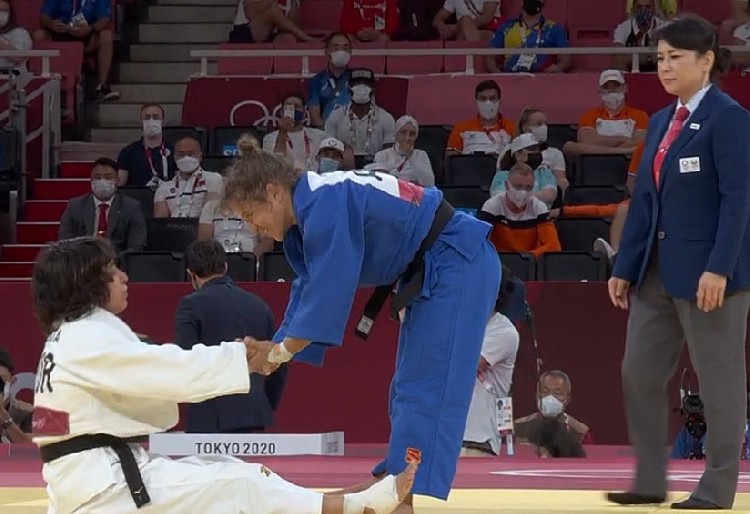 La judoca que defendía el título olímpico logrado en Río 2016 terminó ese cruce con dificultades para mover su brazo luego de una toma de su rival, que la mantuvo contra el piso y forzó el fallo del árbitro mongol Enkhtsetseg Turbat.